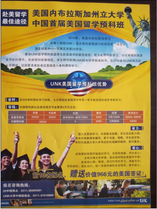 我校與美國內(nèi)布拉斯加州立大學(xué),簡稱為UNK大學(xué),于2009年建立了友好合作關(guān)系,計(jì)劃在2011年1月,在我校聯(lián)合開設(shè)留學(xué)預(yù)科班,我校國際班及優(yōu)秀高中畢業(yè),通過預(yù)科學(xué)習(xí),可獲得保送資格被雙錄取,赴美國內(nèi)布拉斯加州州立大學(xué)進(jìn)行本科學(xué)習(xí)。