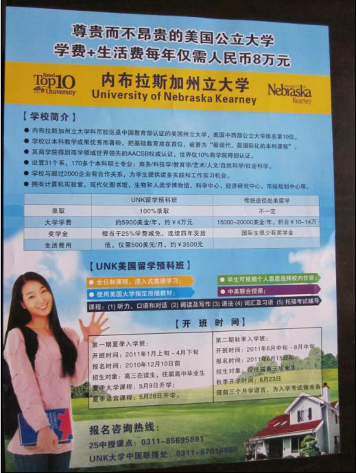 我校美國大學(xué)直通車預(yù)科教育項目啟動 一、項目介紹我校與美國內(nèi)布拉斯加州立大學(xué),簡稱為UNK大學(xué),于2009年建立了友好合作關(guān)系,計劃在2011年1月,在我校聯(lián)合開設(shè)留學(xué)預(yù)科班,我校國際班及優(yōu)秀高中畢業(yè),通過預(yù)科學(xué)習(xí),可獲得保送資格被雙錄取,赴美國內(nèi)布拉斯加州州立大學(xué)進行本科學(xué)習(xí)。2016-09-27
